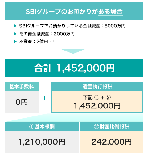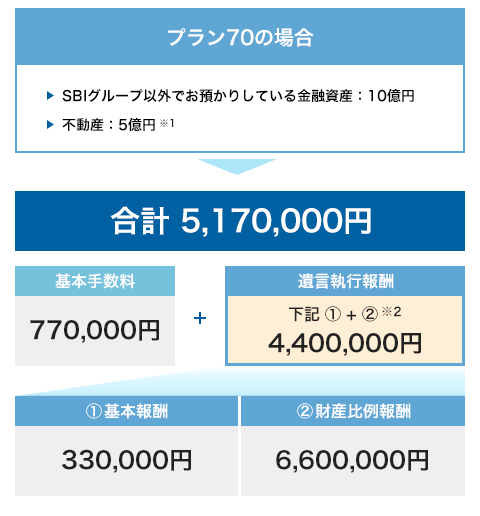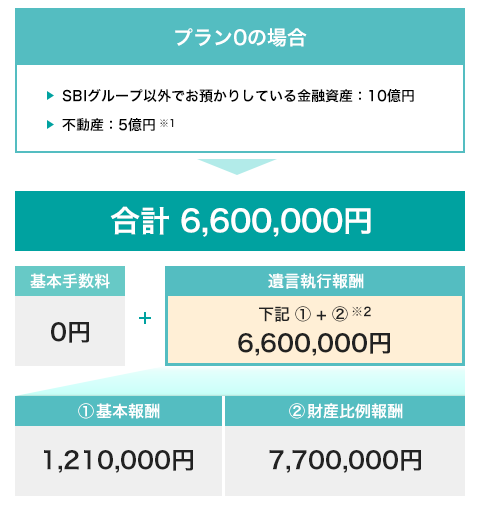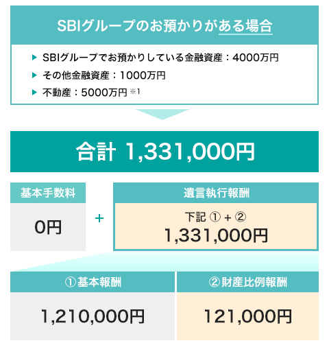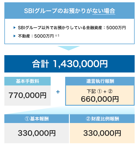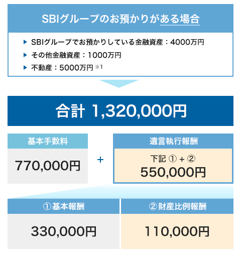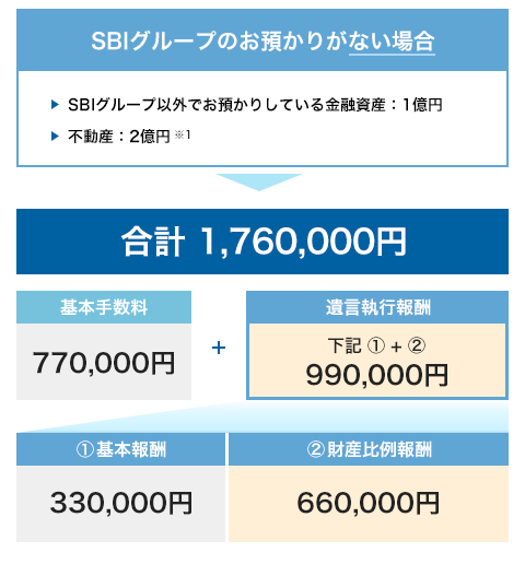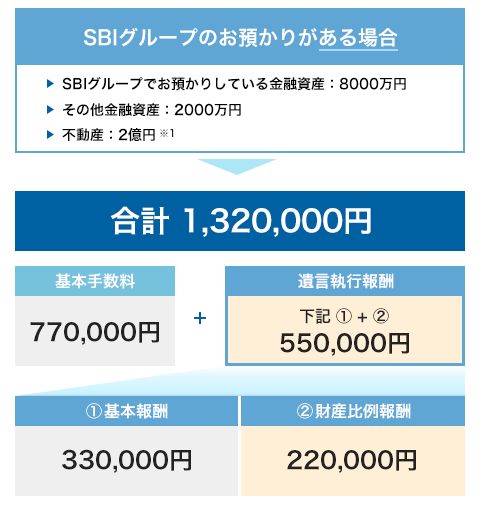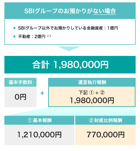 • ※3 財産比例手数料は、遺言執行の対象となる金融資産などの相続税評価額のみに基づいて計算します(不動産の名義変更手続きはサービスの対象ですが、不動産評価額は財産比例報酬計算において算入対象外)。 相続財産評価額はSBI新生信託銀行所定の方法で算出いたします(借入金などの消極財産は控除いたしません)。