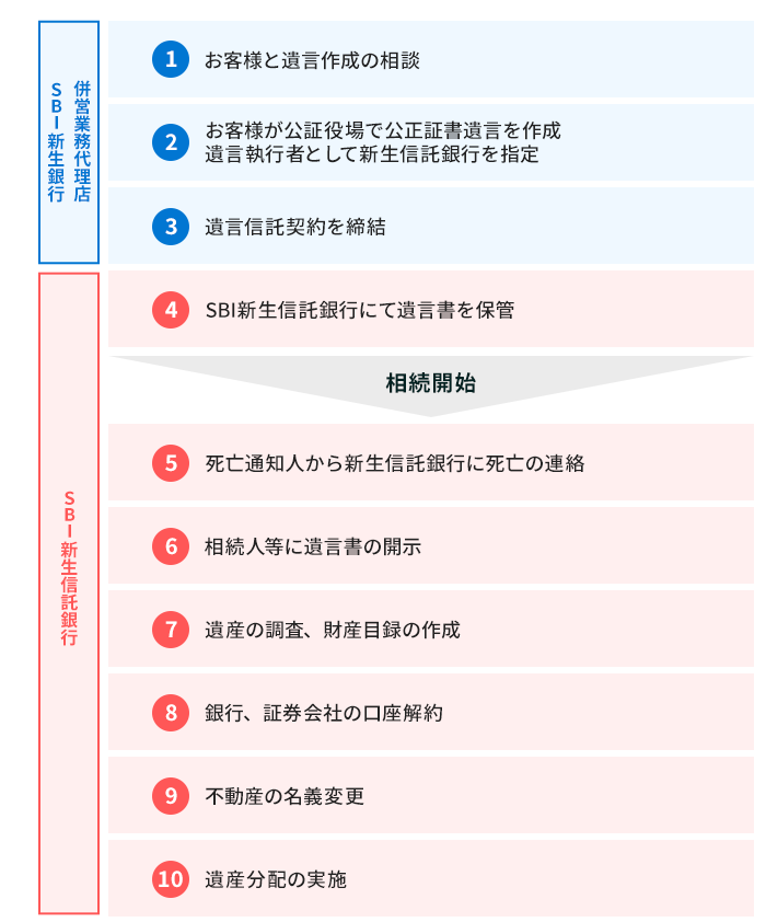 お客さまに公証役場で公正証書遺言を作成いただきます。SBI新生銀行は、お客さまに遺言書を作成いただいた後、SBI新生信託銀行に取り次ぎます。